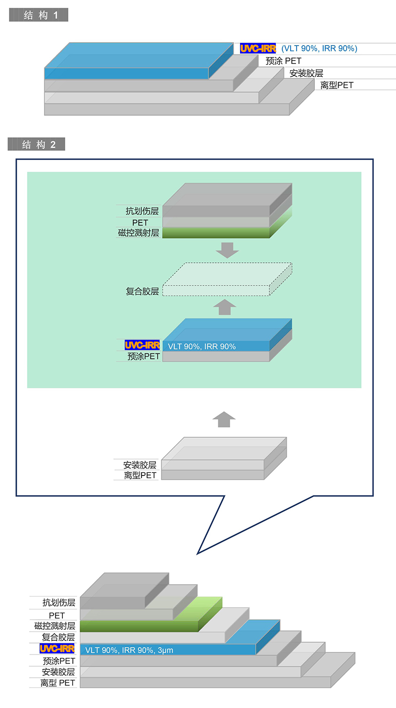 用于生產(chǎn)高性能隔熱太陽膜,UVC-IRR可以多種形成存在于多種結(jié)構(gòu)的太陽窗膜中,以下僅列出兩種。