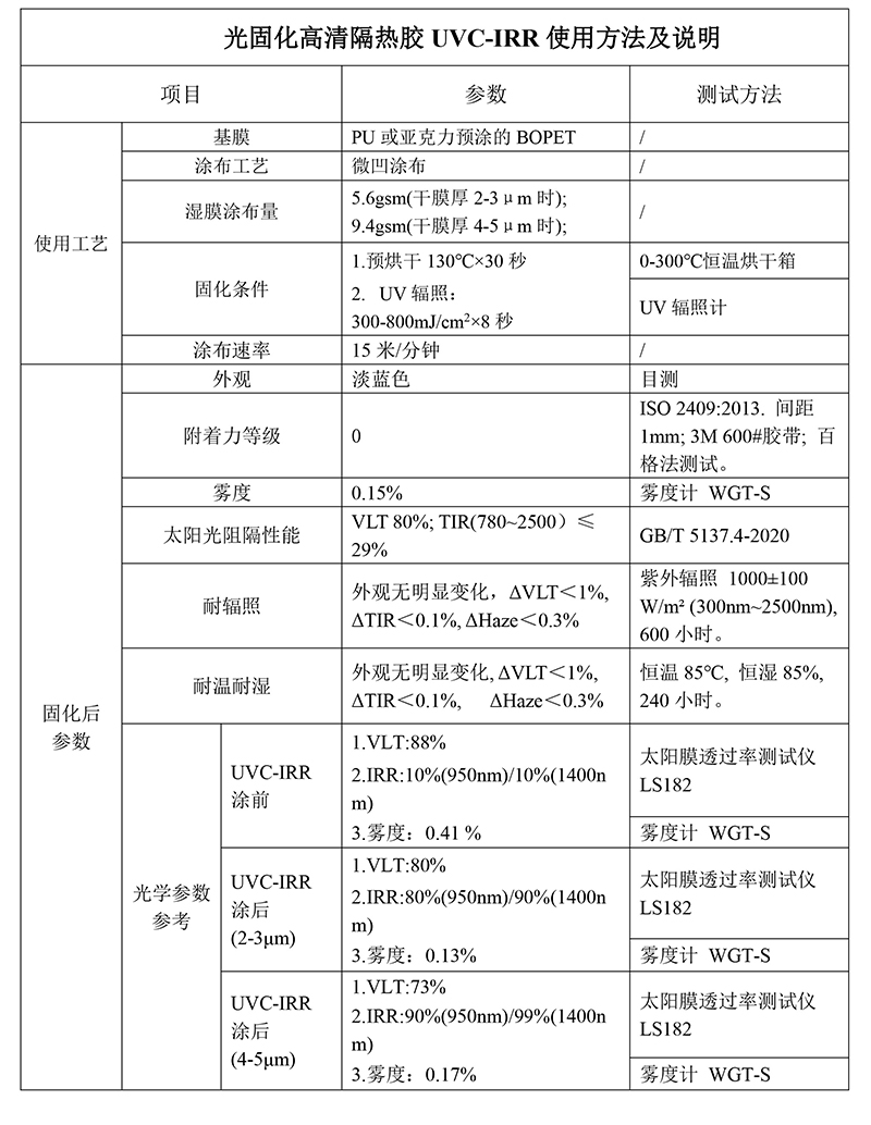 該產(chǎn)品是納米隔熱漿料和UV樹脂的混合液,代號(hào)為UVC-IRR,可直接直接涂布在PET基膜上,在紫外光照下形成隔熱層,用于生產(chǎn)隔熱太陽膜。具有使用方便、成本低、清晰度高、耐候性強(qiáng)的特點(diǎn),可見光透過率達(dá)80%時(shí),紅外線阻隔率達(dá)80%以上。
